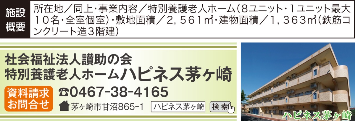 社会福祉法人讃助の会が運営する特別養護老人ホーム・ハピネス茅ヶ崎(甘沼・古知屋光洋施設長)では、入居者が安心して「その人らしい」生活を送ることができるよう、「その人が歩んできた人生を尊重した、心豊かな生活」の提供をスタッフ全員が心がけ、きめ細やかにサポートしている。