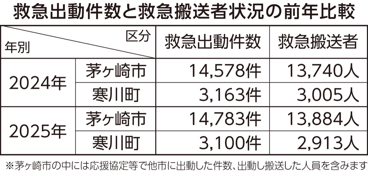 同署によると、昨年に引き続き季節性インフルエンザによる発熱、酷暑による熱中症などの要因が救急出動の増加につながったと推測。「ほぼ横ばいではあるが、年々増えており、消防広域化以降の最多件数となっている」といい、引き続き「救急車の適正利用」や、事故を未然に防ぐ「予防救急」の周知に努めるとしている。