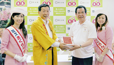11日に町役場で行われた合同記者会見では、はじめに山上貞夫寒川町長が「寒河江市は平成2年に町制50周年を記念し締結した姉妹都市。寒川から元気を送ることができれば」と挨拶。続いて、佐藤寒河江市長が「今年のさくらんぼは例年にない豊作ですが、風評被害や消費の控えで観光客が減っている」と現状を訴えた。佐藤市長によると、今年はさくらんぼの収穫量が20%アップしているのに対し、さくらんぼ狩りバスツアーなどの予約状況は昨年より約4割減っているという。佐藤市長は「品質、価格ともに日本一のさくらんぼの里、寒河江市に来てもらえれば」と話した。その後、佐藤市長は山上町長らと同市で穫れたさくらんぼ『佐藤錦』を試食し、安全性をアピールしていた。
