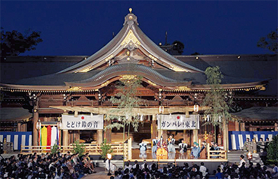 舞台となる本殿には、東日本大震災の被災地を元気づけようと「とどけ鈴の音 ガンバレ!東北」と書かれた横断幕が掲げられた。当日は1500人が参列。祝詞奏上、玉串奉奠(ほうてん)などが行われたあと、被災地の早期復興を祈願して、浪速神楽『鈴扇の舞』が奉奏された。薪能では能『巴』、狂言『樋の酒』、能『舎利』の3番組が披露され、参加者らは幽玄の美を楽しんでいた。