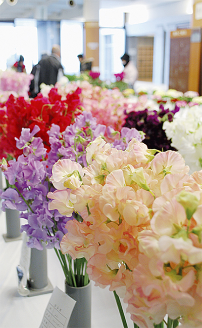 湘南温室組合の「花き持寄り品評会」が2月16日、17日に行われた。これは寒川町、海老名市、藤沢市、座間市で生産された花が出品され、審査、展示販売されるもの。今年は会場となった町総合体育館のロビーに色とりどりの花91点が並べられ、訪れた人々は華やかな美しさに見入っていた。また最終日の17日には販売会も行われ、花を求める人々で賑わった。