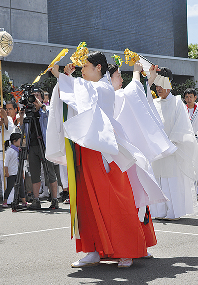 茅ヶ崎海岸で浜降祭が行われたこの日、御旅所となった寒川町商工会駐車場には多くの人がつめかけた。3神社の神輿が並び、寒川神社の利根康教宮司による祝詞奏上などが行われたあと、東日本大震災の被災地復興を祈願し、神前神楽『鈴扇の舞』も披露された。利根宮司は「被災地のご支援をしようと昨年同様に舞いを奉奏しました。少しでも元気が届けば」と挨拶。その後「とどけ鈴の音 ガンバレ!東北」と書かれた横断幕を先頭に神輿が出発。担ぎ手らが威勢のいい甚句や掛け声を響かせながら、神社までを練り歩いた。