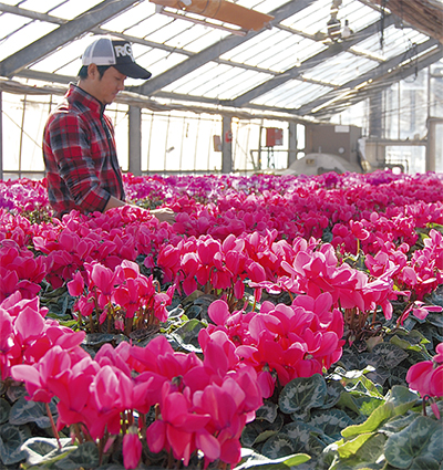 根岸さんによると、ここ数年、生産農家にとって大きな課題は猛暑対策だという。同園では今年、種蒔き時に土を植え替え、夏を迎える前にしっかりした株を作り、猛暑を乗り越えられるよう工夫を行った。「そのおかげで花芽も葉もたくさん出て良い状態」と話す根岸さん。同園ではシクラメンのほかミニシクラメン、ガーデンシクラメン、ポインセチアなども扱っている。