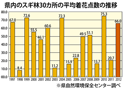 県内の自然環境の保全・再生に関する事業推進などを行う「神奈川県自然環境保全センター」(厚木市七沢)はこのほど、スギの木の雄花の着花量の調査結果から、今年の春の花粉飛散量(予測)が昨年の約3倍となることを発表した。
