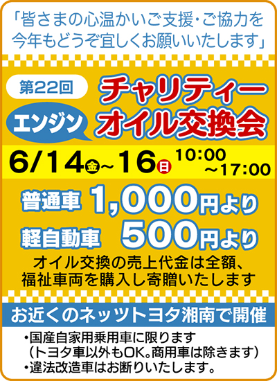 「皆様のご協力をお願い致します」。ネッツトヨタ湘南(株)(本社・平塚市大神)の各店では、売上金の全額を寄付するチャリティーエンジンオイル交換会を今月14日(金)から16日(日)の3日間、10時から17時まで行う。