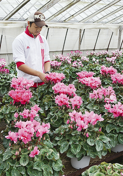 取材に訪れた根岸農園(宮山3778)では、約5000鉢のシクラメンが並ぶ。直売も行っているため、訪れる人の目を楽しませている。「今年も順調に育ちました。いつもの年より少し株が大きめかな」と同園の根岸茂和さん。猛暑対策も奏功し、常連客のニーズにも十分に応えられる出来ばえのようだ。