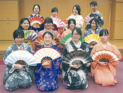 練習場である視聴覚室に入ると、色とりどりの浴衣に身を包んだ生徒たちがイキイキとした表情で練習に励む姿が。「大きくまわって」「もっと足の角度をつけて」柳川教諭の指示が飛ぶ。「自分たちで着付けをして、たたんでしまって、お茶やお花も一通りこなします。先輩の姿を見ながら年々レベルが上がっていますよ」と柳川教諭。町内のイベントなどで踊りを披露する機会もあるそうで、生徒たちは「舞台に上がれてやりがいがある」と口を揃える。また「茶道の時間は和菓子が食べられる」といった現実的な楽しみも。休んだり、退部したりする生徒は少ないそうで、夢中でけいこに励む姿が印象的だ。柳川教諭は「こまやかな気遣いや、思いやりの心も学んでほしい」と話している。6月1日(日)に町民センターの「浴衣ざらい」に出演する。