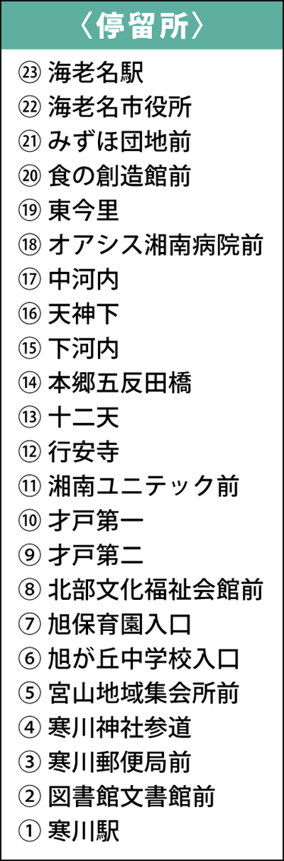 寒川町と海老名市は、寒川駅と海老名駅を結ぶ新バス路線の開設を目指し、10月1日から実証運行を開始した。半年間の利用が好調であれば、このまま新路線として運行を続ける方針だが、1時間に1往復程度と本数は少なく、本格的に利用者が増えるのは将来的にインフラが整備された後と考えられるため、判断が注目される。