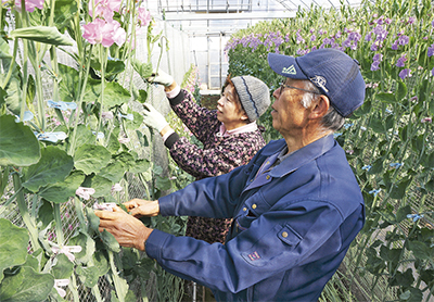 北村さんは妻の美代子さんと2人でスイートピー栽培を行っている。当初はカーネーションを栽培し、その後しばらくスイートピーと両方を栽培していたというが、近年はスイートピー1本に。自宅横にある温室内ではピンクや紫の花が目立つが、美代子さんが「薄いピンクの花びらが好き」というフラミンゴなど、7種類の花々が出荷を待つ。