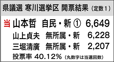 新人3氏の争いとなった神奈川県議会議員選挙は4月12日に投開票され、寒川町選挙区では山本哲氏(45・自民党)が初当選を果たした。本紙では、当日の開票所の様子をレポートする。