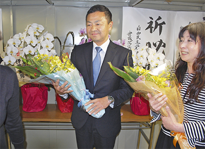 その10分後、山本氏の選挙事務所では、当選のあいさつが始まった。【中面で人物風土記】