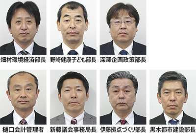 【部長級】◎深澤文武/企画政策部長(企画政策部企画政策課長)◎野崎誠/健康子ども部長(企画政策部財政課長)◎畑村正樹/環境経済部長(環境経済部産業振興課長・農業委員会事務局長)◎黒木久/都市建設部長(拠点づくり部寒川駅周辺整備事務所長)◎伊藤研/拠点づくり部長(拠点づくり部倉見拠点づくり課長)◎新藤聡/議会事務局長(総務部総務課長)