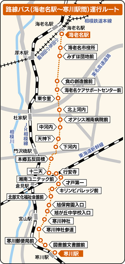 3年前の実証運行開始に当たり、寒川町ではコミュニティバスの「北ルート」、海老名市では「本郷ルート」を休止した。これに伴い寒川町と海老名市が方策を検討。神奈川中央交通(株)、相鉄バス(株)の2社と連携し、公費負担を減らしつつ公共交通網整備と利便性向上を図るため、路線バス運行に至った。