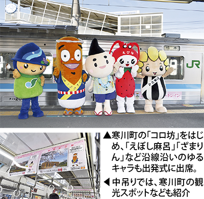 車両は4両編成で茅ヶ崎から橋本間を運行し、一部は八王子まで乗り入れることもある。運行期間は7カ月間を予定。18日にJR茅ヶ崎駅で出発式が行われ、沿線市町のゆるキャラも応援に駆け付けていた。