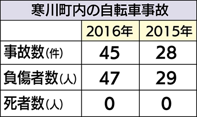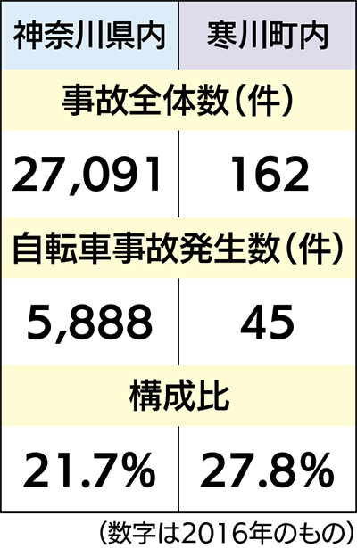 寒川町内で発生した2016年中の全事故の負傷者数は184人、死者数は0人。このうち自転車事故での死亡事故は0件、負傷者数は47人で、全事故の25・5%を占めた。