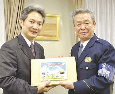 山口署長は「目にした人の防犯意識が高まるので、本当にありがたい。我々も管内から一件でも犯罪を減らせるよう努力する」と述べ、藤江組合長は「年ごとに内容を改訂しながら寄贈を続けていきたい」と話した。カレンダーは自治会や関係団体に配布される。