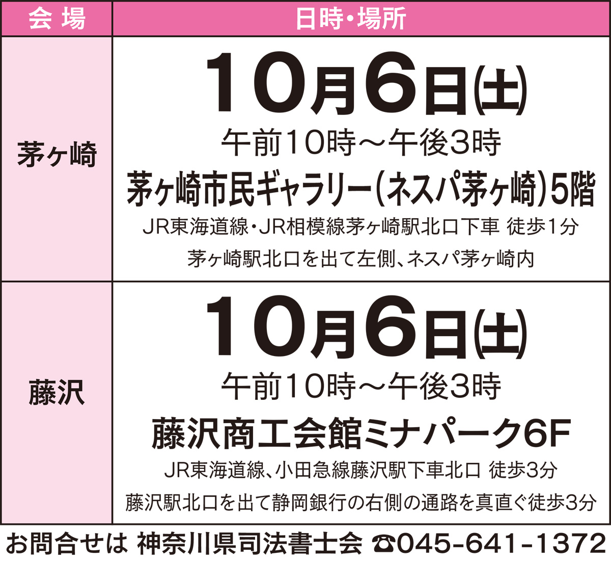 県内の司法書士と司法書士法人が所属する「神奈川県司法書士会」(星野務会長)は10月1日の法の日を記念して各地で「無料法律相談会」を開催。司法書士が相続や遺言、成年後見、労働トラブル、借金、会社や土地・家屋の問題など業務範囲内の様々な悩みに応じる。詳細は県司法書士会へ。