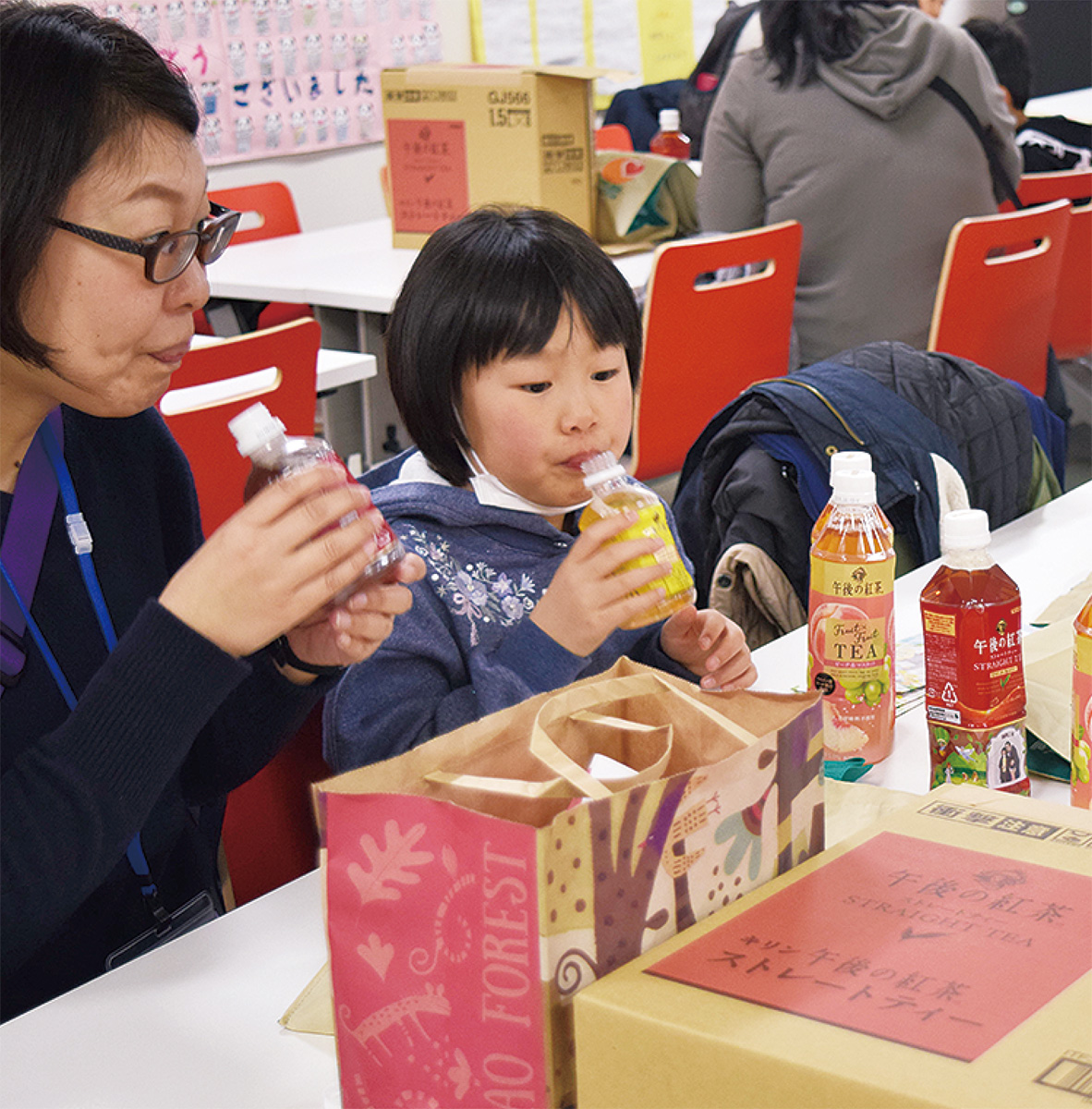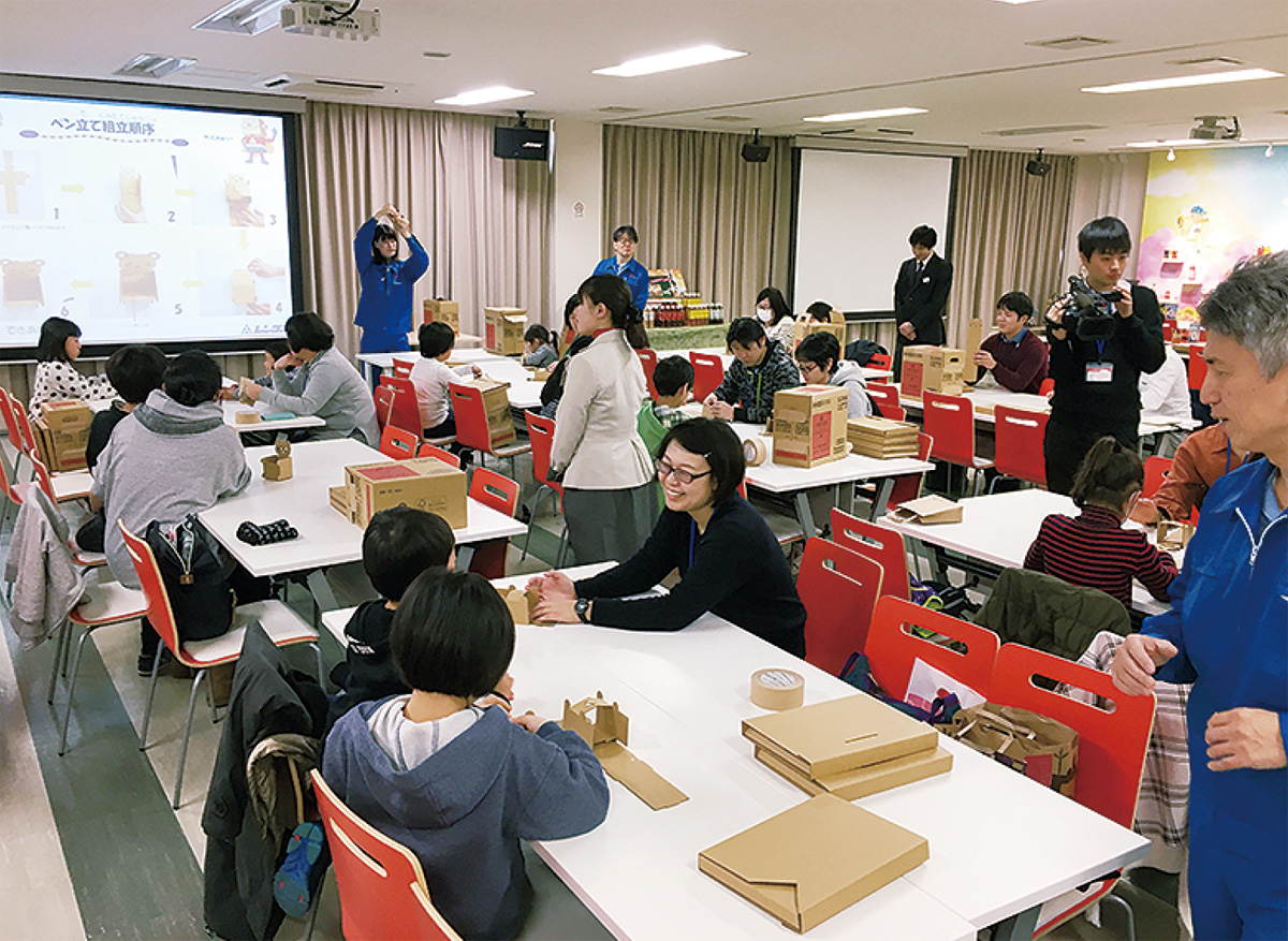 キリンビバレッジの工場に集まった参加者は、レンゴーの出前授業「段ボールおもしろ教室」で、ダンボール製のペン立てや書類入れなどの組み立てを体験し「午後の紅茶」の製造ラインなどを見学。顔写真入りのオリジナルラベルを貼る作業などを楽しんだ。