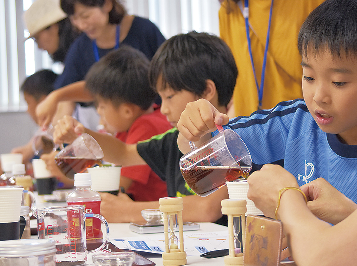 小学生向けの自由研究応援企画で、親子連れが注ぐのは異なる温度で淹れた紅茶。色や香りを比べ、紅茶の渋みとなるタンニンの濃度も薬品で色づけし、観察。工場ライン見学で歓声も上がった。