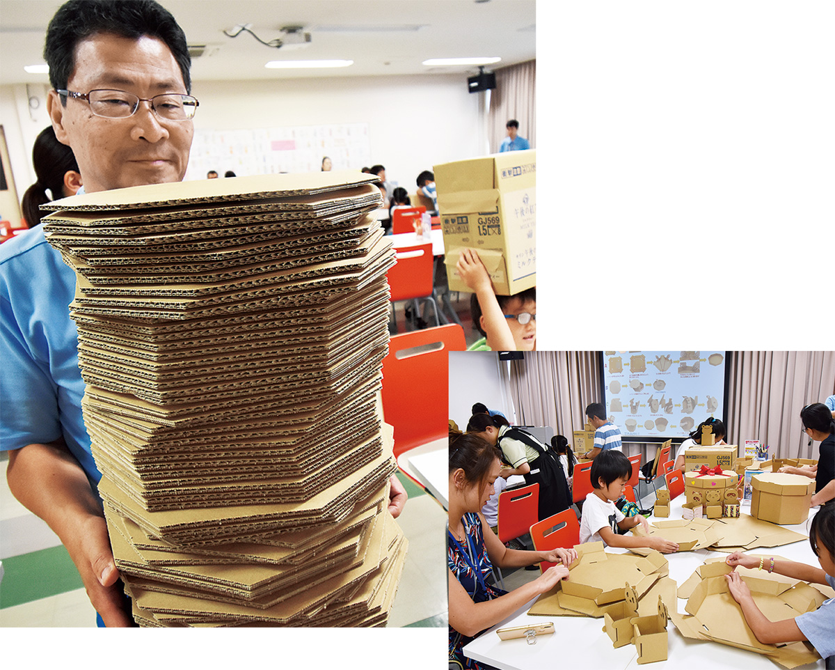 倉見のキリンビバレッジ湘南工場で8月22日、小物入れや箱作りのワークショップが開かれた。夏休みの自由研究を応援する企画で、材料は「午後の紅茶」などの梱包に使う段ボール。こちらは宮山に工場のある(株)レンゴーで製造されており、会場では同社スタッフが段ボールのひみつを紹介。段ボールの「ボール」が外国語の厚紙を意味する「ボード」に由来しているエピソードや、中身の段になっている「トラス構造」など、強さの理由も紹介。親子連れが完成した箱を押すように確かめていた。