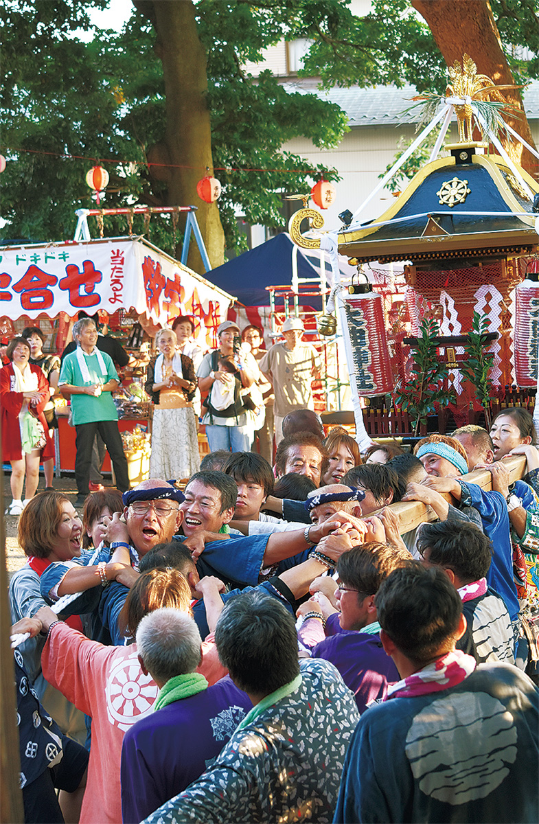 大曲神社の例大祭が9月1日に行われ、真っ白のさらしで飾った神輿が町内を巡った。威勢の良い掛け声とともに茶色い肌の担ぎ手が汗を散らす様を、お囃子が鼓舞し続けた。宮入りでは神輿が名残惜しそうに境内で練り、来場者が見守った。例大祭は参加者が年々増加傾向にあるという。神輿愛好会の山口賢吾さん(37)は汗を光らせ「今回は特に最高」と語った。