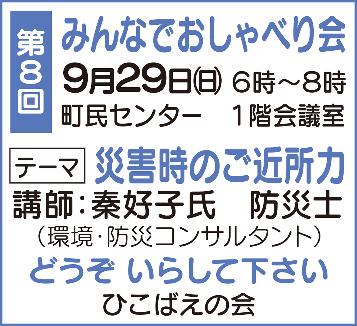 9月は台風到来の季節です。地球温暖化の影響で風雨も更に厳しくなってきています。自然災害に加え、インフラの老朽化、高齢化も含め社会基盤の弱体化も視野に入れ、危機意識をもってまちづくりを考えねばなりません。寒川町の洪水ハザードマップは相模川・小出川・目久尻川のはん濫は想定していますが、下水道があふれたり、道路の冠水は対象外です。災害の危険性は人と場所によって異なります。自分の命を守るには何が必要かを過去の教訓から学び、少しでも安全性を高める心構えをしておくことが肝要です。備えあれば憂いなし。日頃からご近所の皆さんとの支えあい、助けあいの地域づくりが災害に強い町につながります。