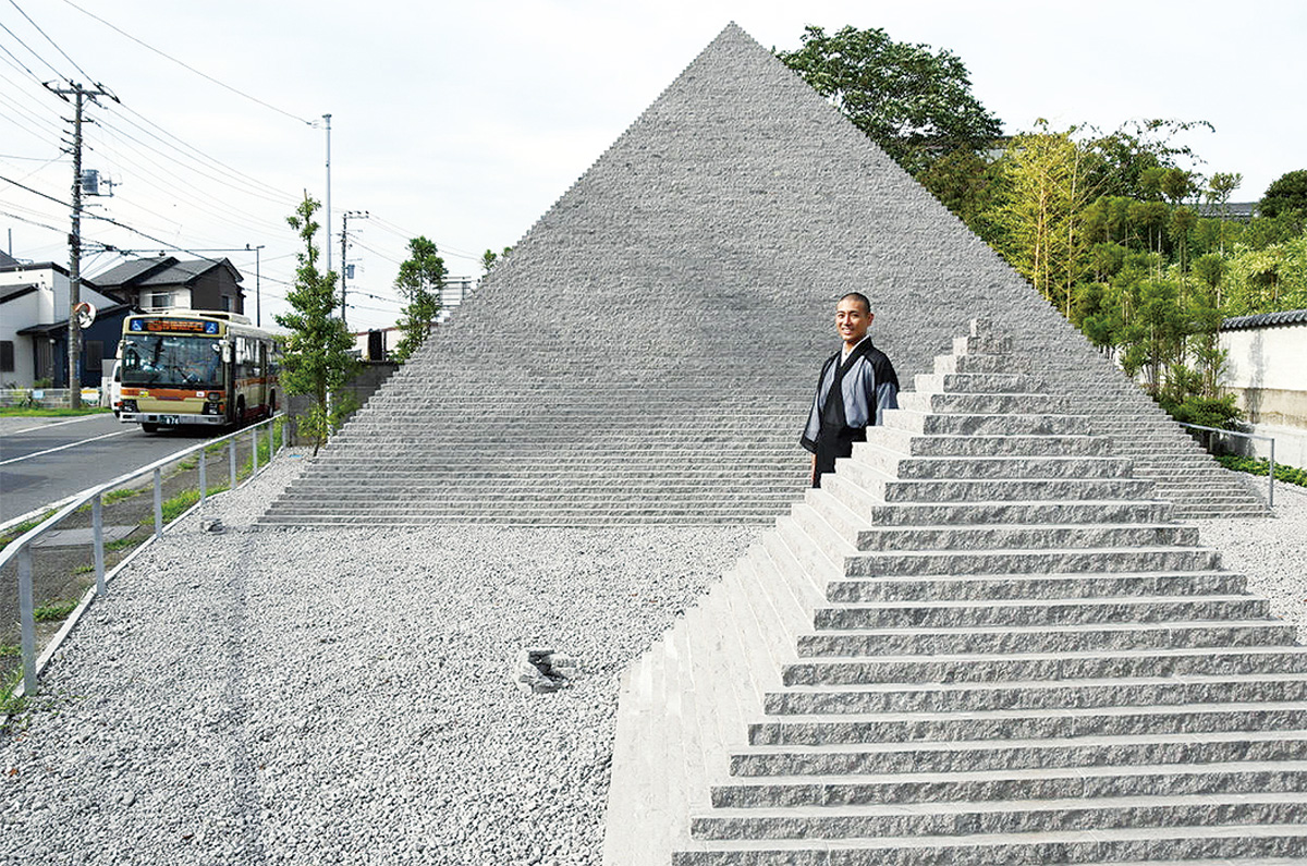 寒川町の東に伸びる中原街道の先、深谷交差点(綾瀬市)に、このほどピラミッドが出現した。この構造物は、深谷中の日蓮宗大法寺(菊池重忠住職)が建立した永代供養塔。内部に納骨室と礼拝空間がある。ピラミッド型にしたのは「この場所は綾瀬の中心地として古くから人々が行き交った街道沿い。名所のひとつになれば」という思いから。明るい色の白河石を百段(5メートル)積み上げ、地下には逆三角すいの穴(非公開)がある。「地域の安全と発展も願い建立した。道行くときに心の中でお祈りしたり、散歩がてら立ち手を合わせて頂ければ嬉しい」と菊池住職。傍らにある小型のピラミッドはペット用の納骨塔という。