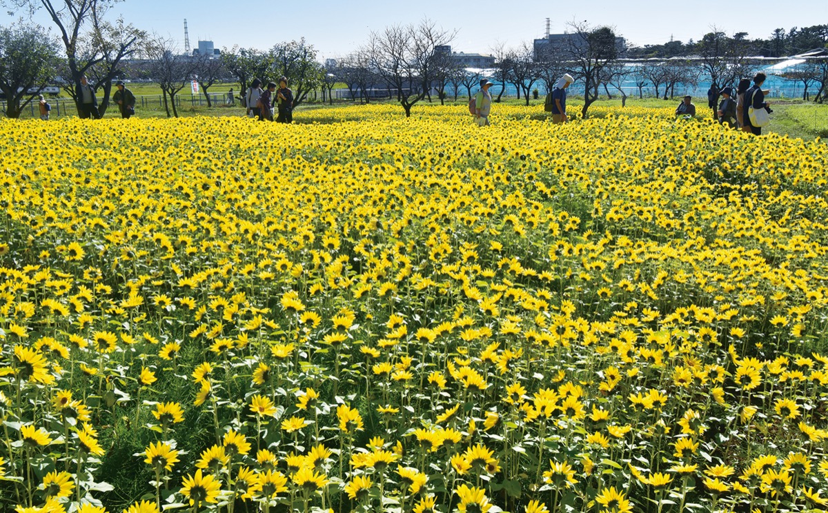 寒川神社近くの畑で観光協会による冬のヒマワリが見頃を迎えた。例年よりも敷地を増やした約2千平方メートルに17万粒の種をまき、7万輪ほどが開花。例年よりも6日ほど早いという。今年は台風でなぎ倒される被害もあったが、健気に咲く一面の黄色に来場者からは感激の声が続出していた。