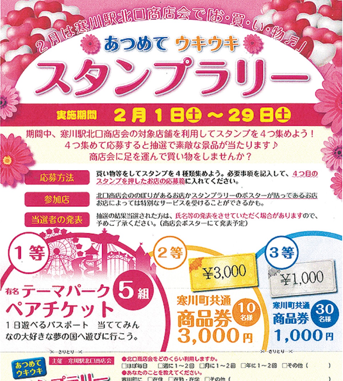 寒川駅北口商店会が主催する「あつめてウキウキスタンプラリー」が2月1日〜29日まで、駅北口周辺で開催される。