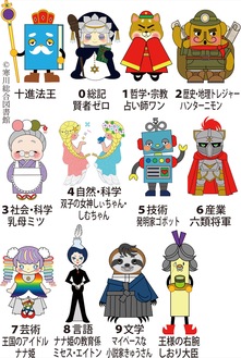 ユニークなキャラクターは全部で13人。書籍のジャンル分けに使われる「日本十進分類法」に親しんでもらい、本を探してもらおうと図書館の職員3人で考えた。たとえば「2」の歴史・地理は、昔の事を調べるのが好きな「ニモン」。十進法王は乳母が作る羊羹が好きで朝が弱いなど、1体ごとに設定が深い。プロの作品にも見えるイラストを手掛けたのは、吉村美香さん。もともと色鉛筆で描く事が得意で、キャラは「ワード」ソフトの図形ツールを組み合わせて作ったという。