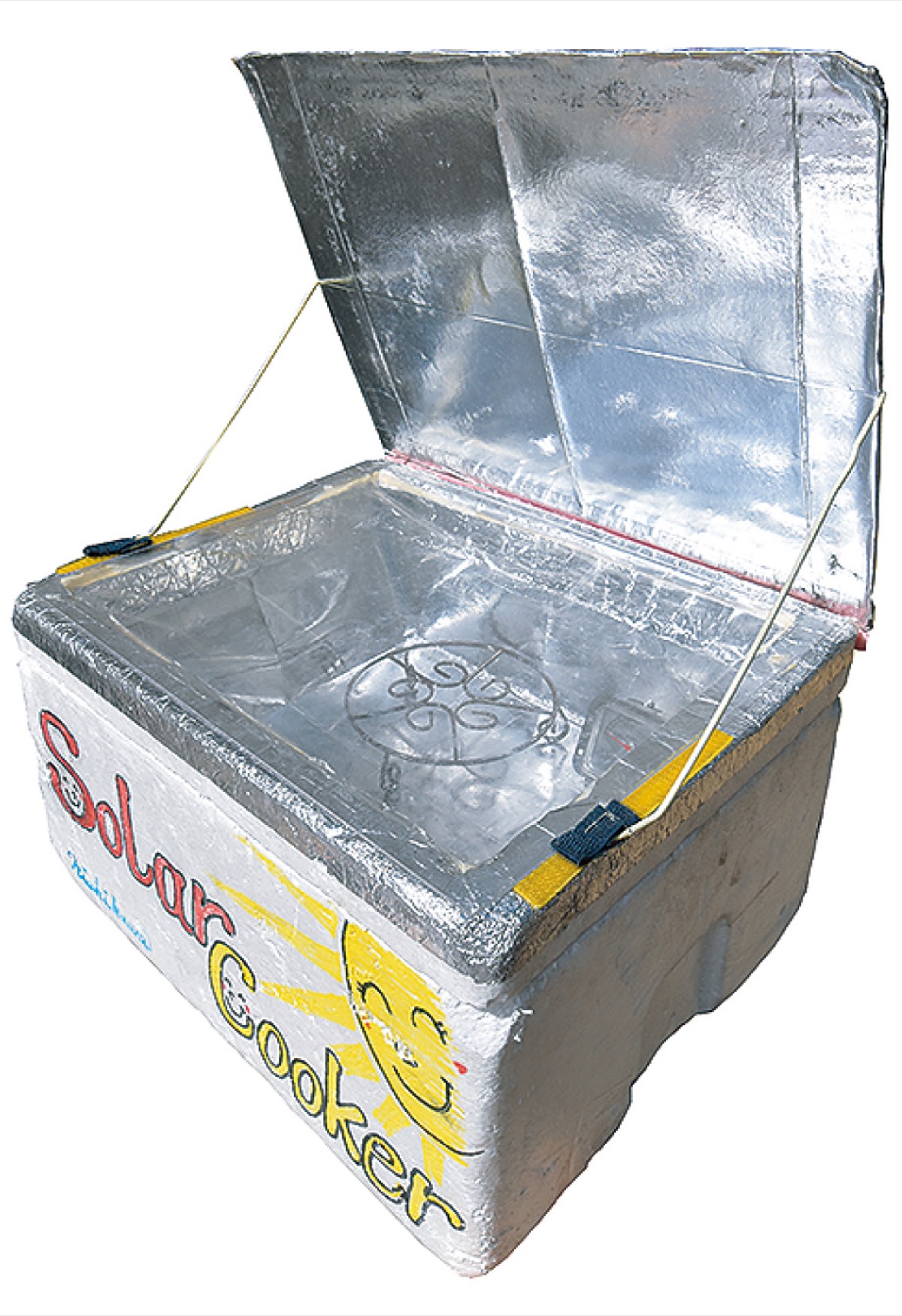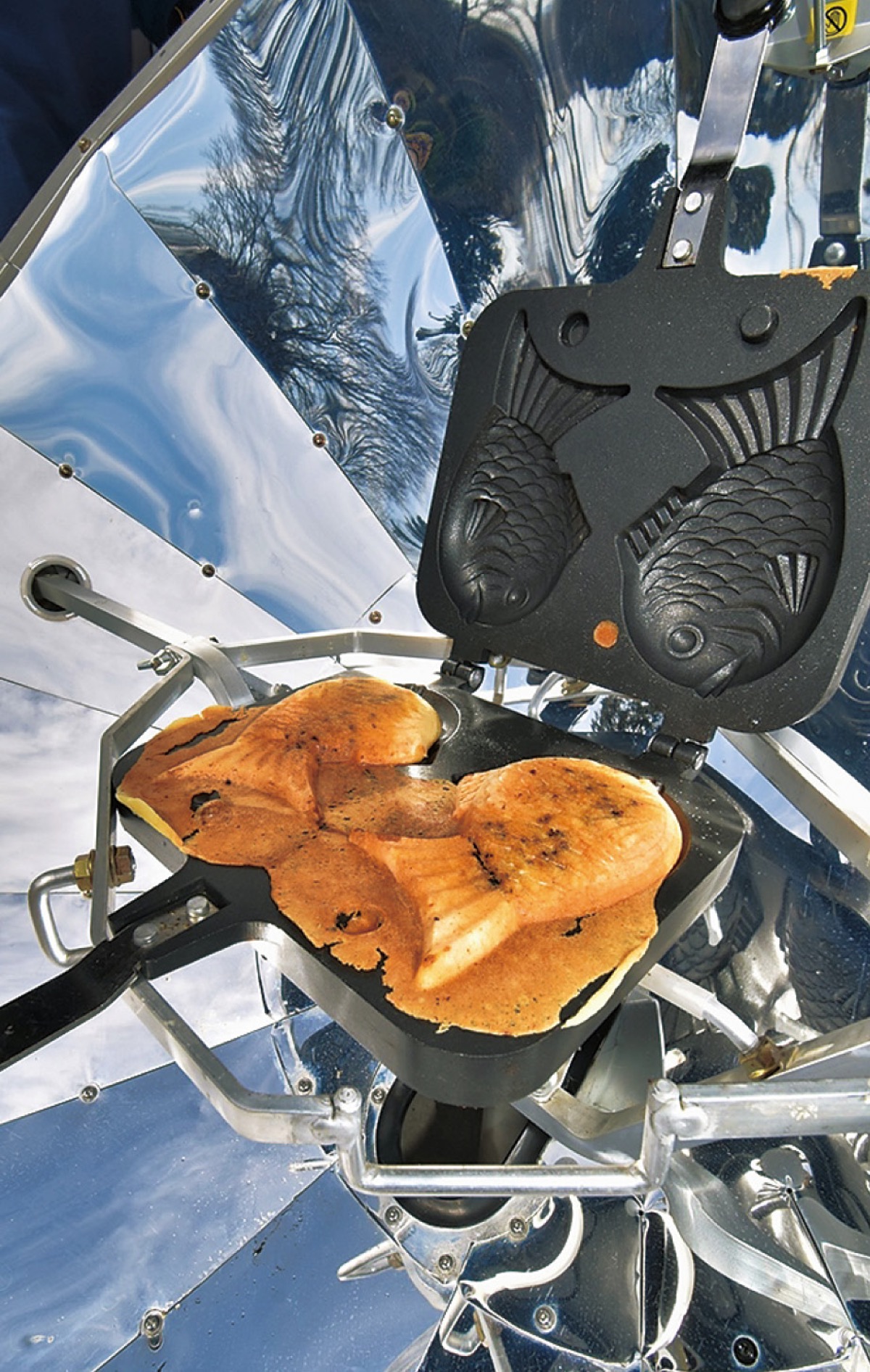 まるでアンテナでの交信――寒川町近くの里山公園で月1回、太陽熱調理器のイベントが開かれている。調理を解説しているのは茅ヶ崎市小和田の西川豊子さん(70)。超魔術を思わせるゴーグルは目の保護のため。25年前に加わった自然エネルギー推進団体の活動を通じ、調理器を知った。「当時は知られていなかったけど、美味しさを広めたくてね。見た目は魔女みたいでしょ?」。8年前から里山公園との連携でイベントを開催。自作の箱型調理器や、折り畳み式調理器、フードドライヤーも並ぶ。鍋を開けると、ちらし寿司に鯛焼きも。夏なら米2合が30分ほどで炊けるという。