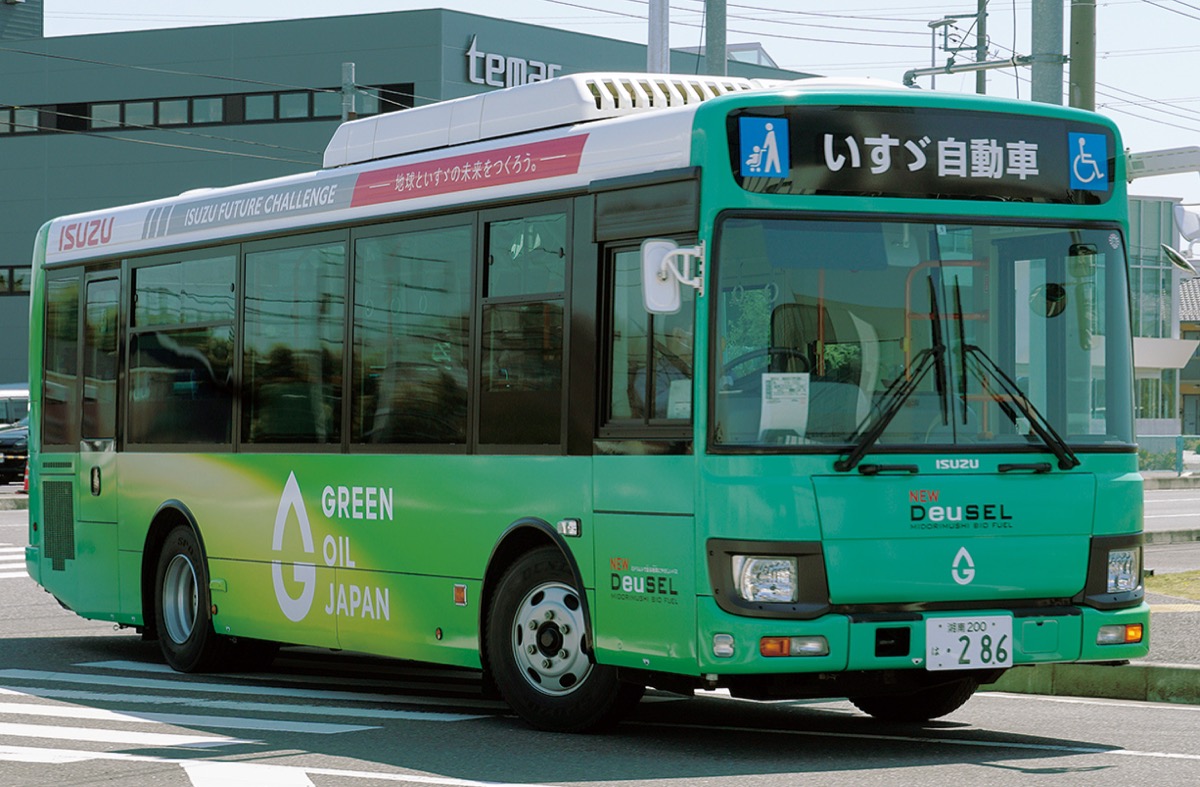 いすゞ自動車(株)(東京都品川区)と(株)ユーグレナ(港区)が微細藻類ユーグレナ(ミドリムシ)を原料に開発したもので、軽油と同等の性能があるという。ミドリムシは体長0・05mmの小さな藻の一種。光合成でCO2を吸収し成長する過程で油を作り出す。燃料はこの油と学校や家庭の廃食油を再利用したもので構成される。バスはいすゞの藤沢工場と湘南台駅を結び、平日に約16往復している。