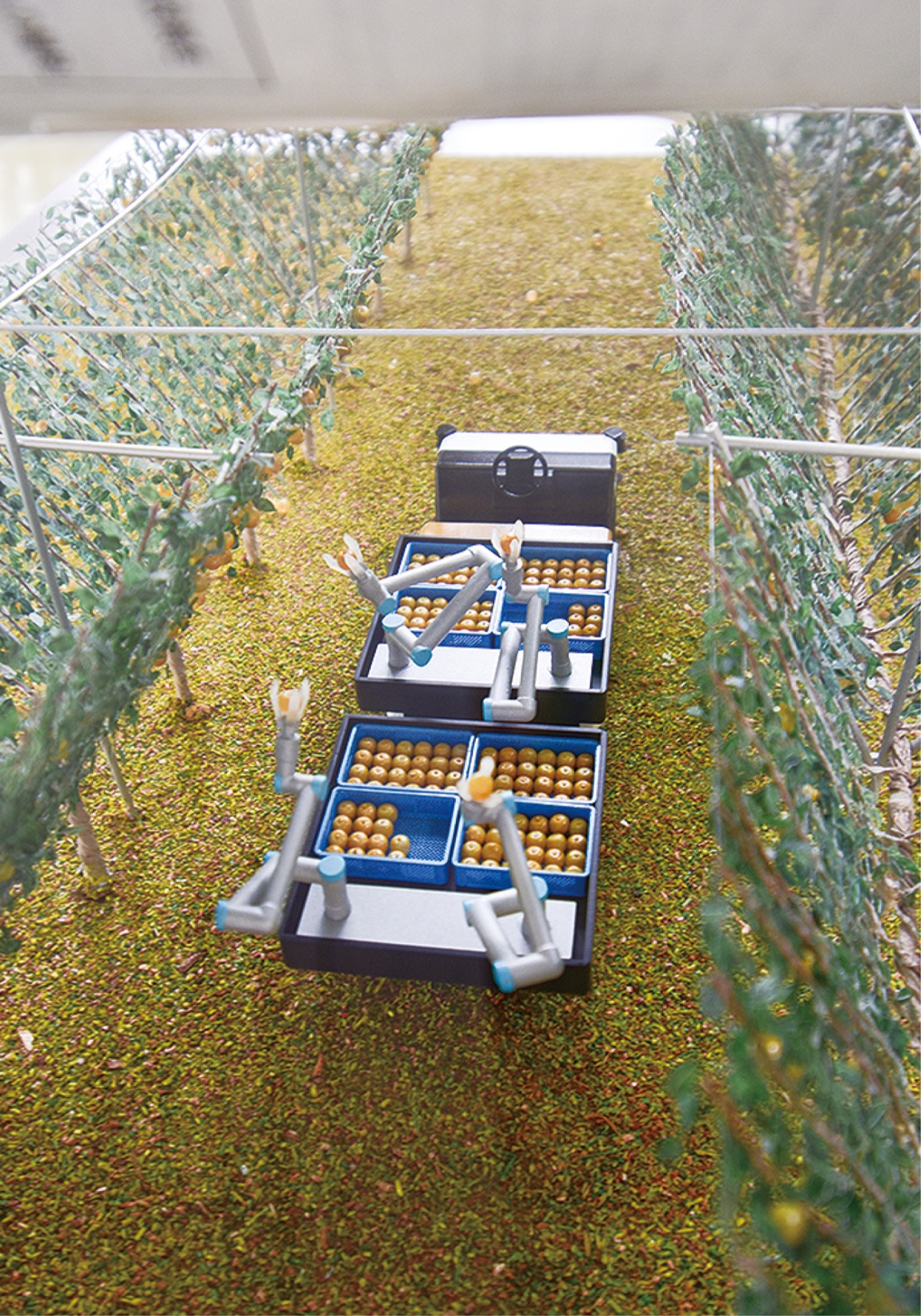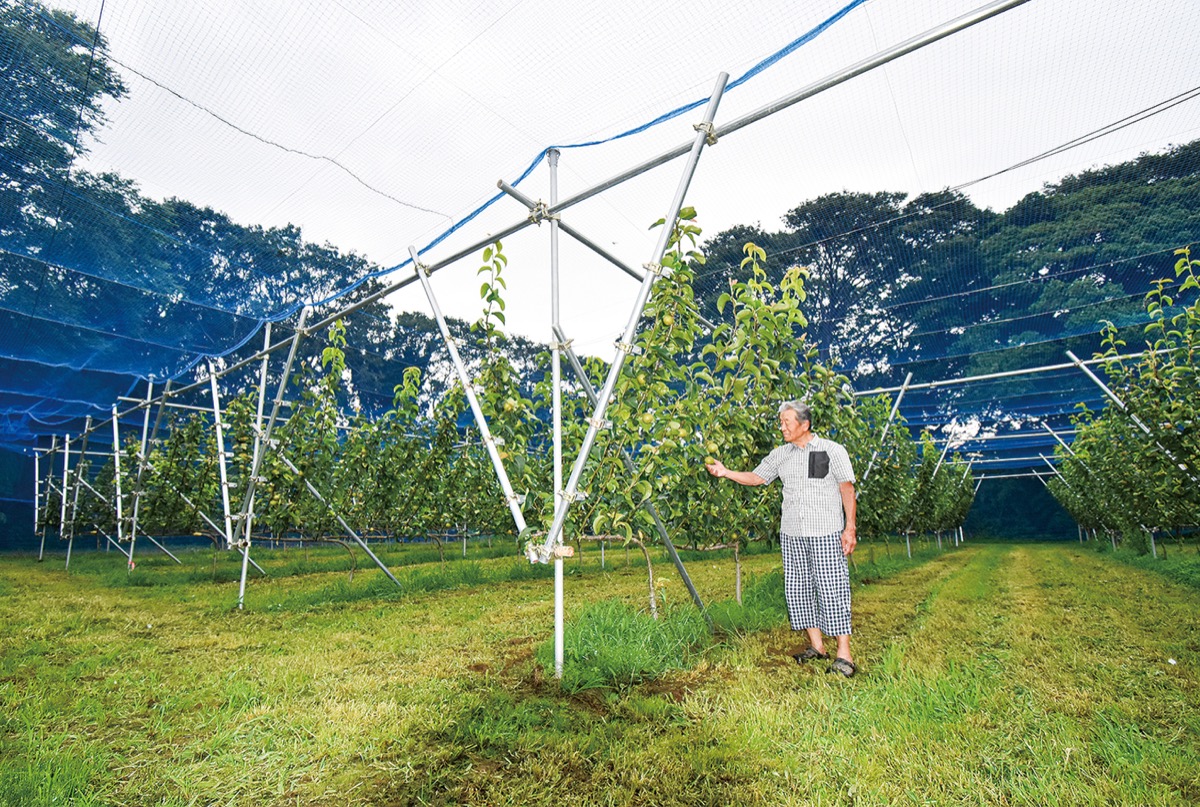横溝義則さん(88歳)は梨の栽培歴約50年のベテランだが、3年ほど前から「新しいことを始めたい」とV字棚に挑戦。この技術は13年ほど前に県農技術センター(平塚市)の職員が梅の栽培法として考案し、梨に応用する形で研究が続けられている。横溝さんは自分で鉄V字にパイプを組み、センターの指導を受けながら若木を育ててきた。「両腕を高く上げての作業が減り、本当に楽になった。腕って意外と重いんですよ」。すでに実が収穫でき、味も収穫量も平棚と変わらない。横溝さんの夢はロボット収穫だ。同センターが産官学の連携で開発しており、直線的なレイアウトを生かして収穫や農薬散布などを自動化するというもの。従来の労力を半減できる可能性もあり、2025年の実用化を目指している。