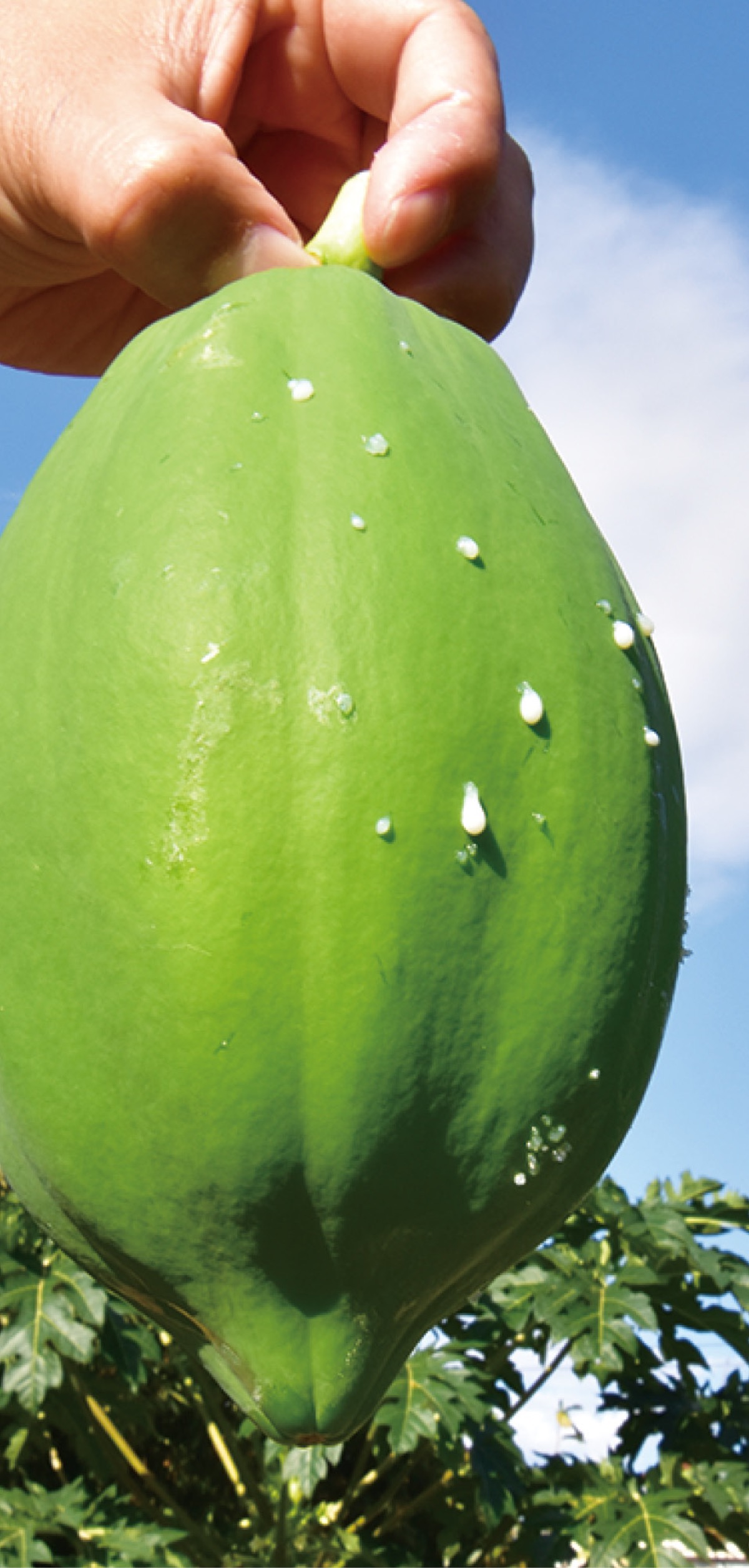 金子共秀さん(49)が4年ほど前から栽培を始めたもので、4月に植えた30cmの苗は2m以上に成長。途中で肥料も多めに与えたという。獲れたては表面をつつくと乳液のような汁を出す。果実の甘さは控えめでゴーヤチャンプルーのように豚肉などと炒めたり、かき揚げのように料理すると美味しい。金子さんのパパイヤはJAのわいわい市に出荷されている。