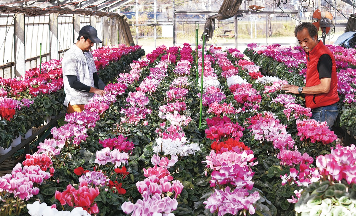 寒川町の名産でもあるシクラメンが出荷シーズンを迎えた。根岸農園(宮山)では「ミルキーガール」や「プルマージュ」など約30品種の鉢が個性豊かに咲き誇り、つぼみを中心に寄せる作業が行われている。