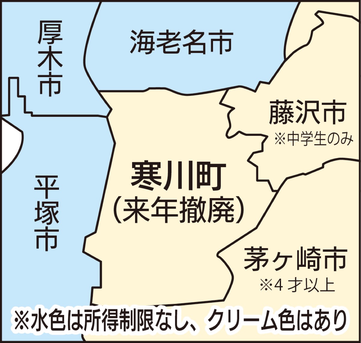 元々「子どもが経済的な理由で受診できない事がないように」という趣旨の助成だが、所得制限の有無「自治体間の競争もあり、どこに住むかのポイントになっている」(担当課)のも事実。周辺では藤沢市が小学生まで所得制限がなく中学生以上は制限つき、茅ヶ崎市は4歳以上は所得制限を設けている。海老名市や厚木市、綾瀬市は所得制限がなく、平塚市は今年撤廃している。