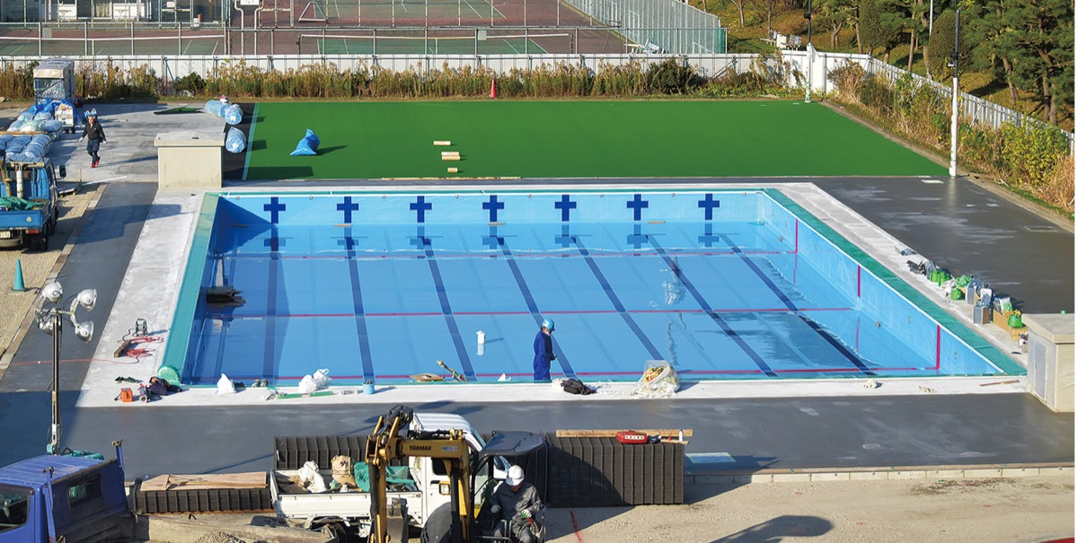 来年夏のリニューアルオープンに向けて工事が進む町営プール(水道記念館隣)では、新しい25mプールがほぼ完成という状況だ。元々は50メートルプールがあった。
