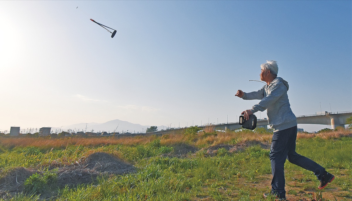 松下成夫さん(71)によると「ハンドランチグライダー」に没頭してもう2年。これまで半世紀にわたって様々なラジコンやドローンを扱った。このグライダーに出会ったときは、静寂性に驚いたという。カーボン製の機体はわずか200グラム。飛ばすと高度40mほどを旋回した後、ふわりふわりと降り、見えない糸に引かれるように松下さんの手に帰ってきた。羽は動くがプロペラもエンジンもない。ゆえに上昇気流をつかむ必要がある。「風と遊ぶ感覚ですね。あおられたりすることもあるけど100回飛ばせば100通りの飛び方をするのが面白い。私はまだ初心者。あれが私の先生です」。指差す先にトビが滑空していた。