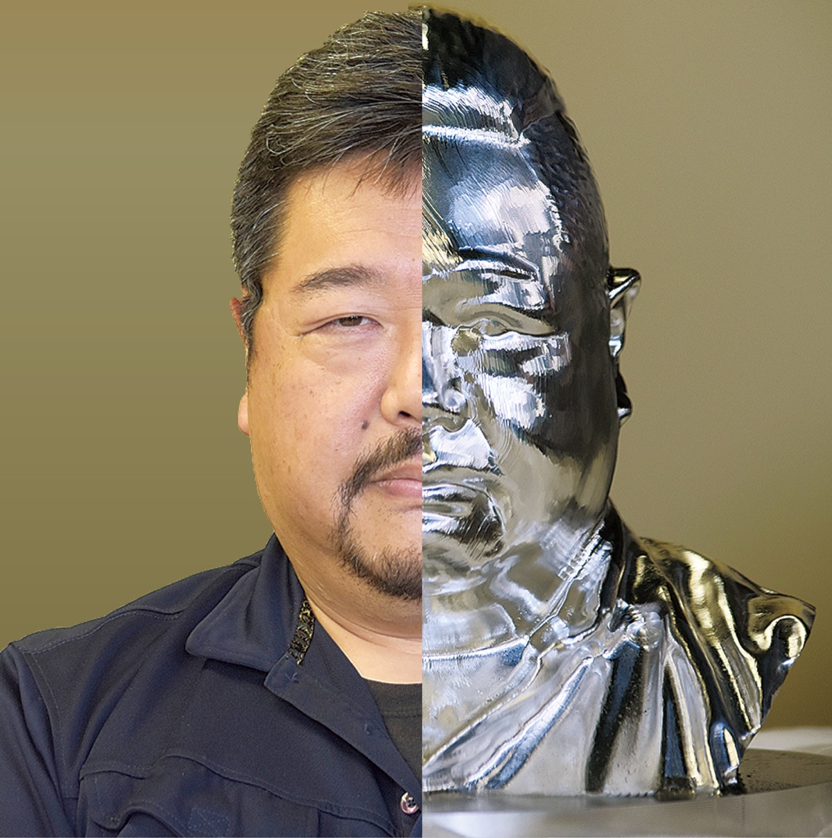 高さ20センチほどの胸像はアルミニウム製で「ターミネーター2」を思わせる仕上がり。モデルは倉見の(有)湘南マシーンの菊地慎一社長(53)だ。