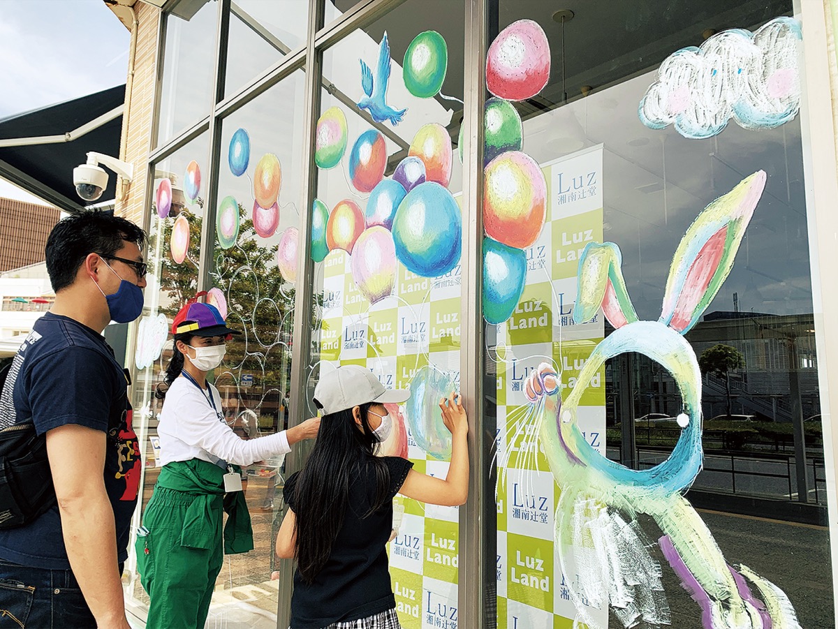 コロナ禍で外出を自粛している子どもたちに、「少しでも楽しい思い出を」と、屋外ワークショップイベントとして企画。茅ヶ崎在住のチョークアーティスト・千葉和恵さんとBujungさんが講師を務め、約70人の参加者がガラスに太陽や海、楽しい街並などを描いた。ハート型のフォトブースは5月末まで撮影できる。