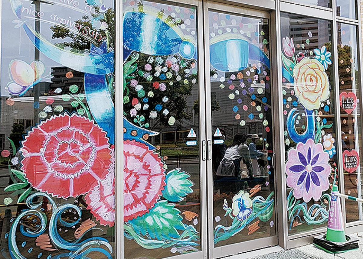 辻堂駅前の商業施設「Luz湘南辻堂」の1階ガラス面に、縦2m×横14m程の巨大なチョークアートが完成した。