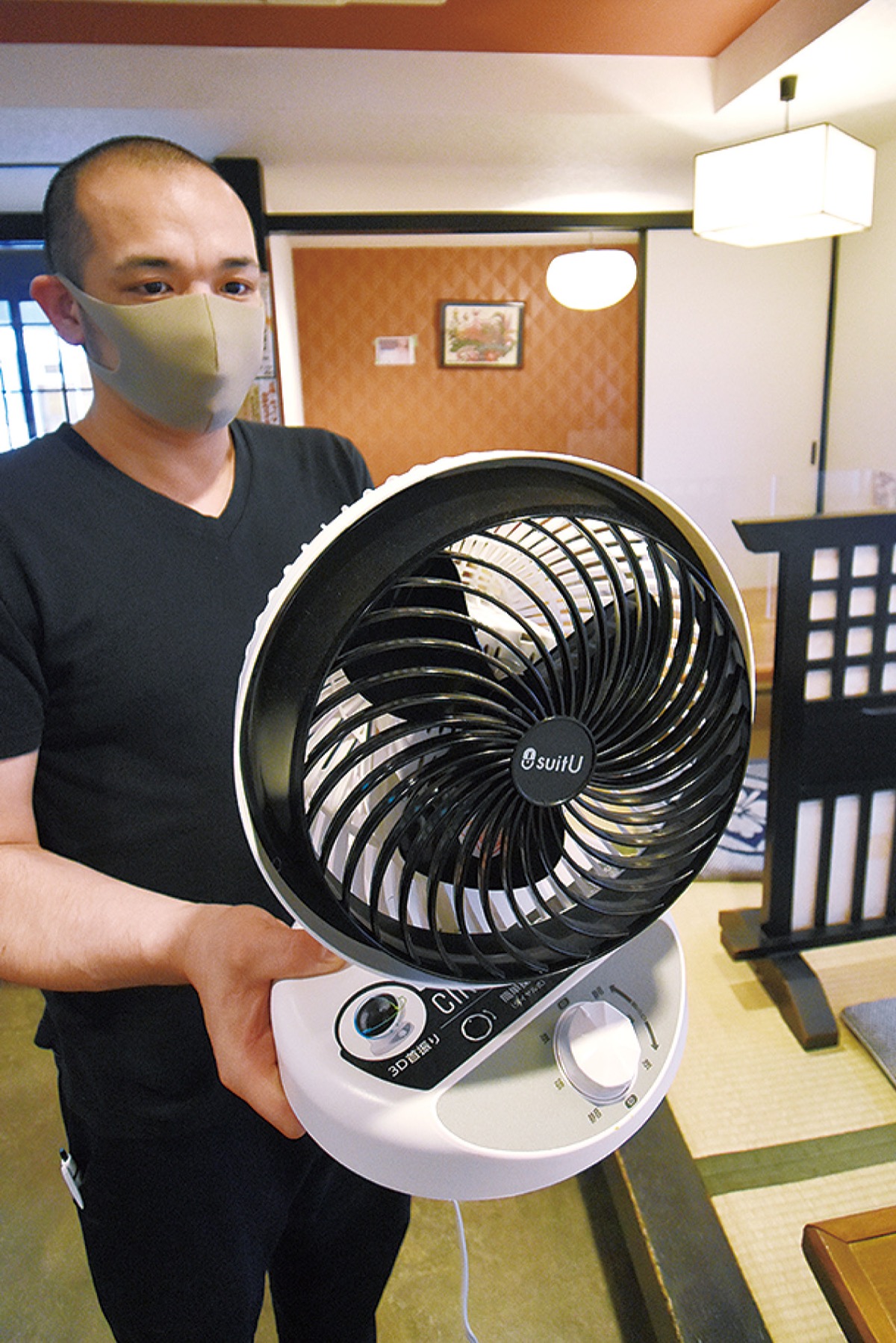 これは空気中の二酸化炭素(CO2)の濃度測定器で、換気の目安(1000ppmほど)が分かる装置。同店では2月に県の事業を活用して導入した。「換気のきっかけをはっきり捉えてくれますよ。来店者の安心感につながるのでは」と同店の若林隆さん(53)。