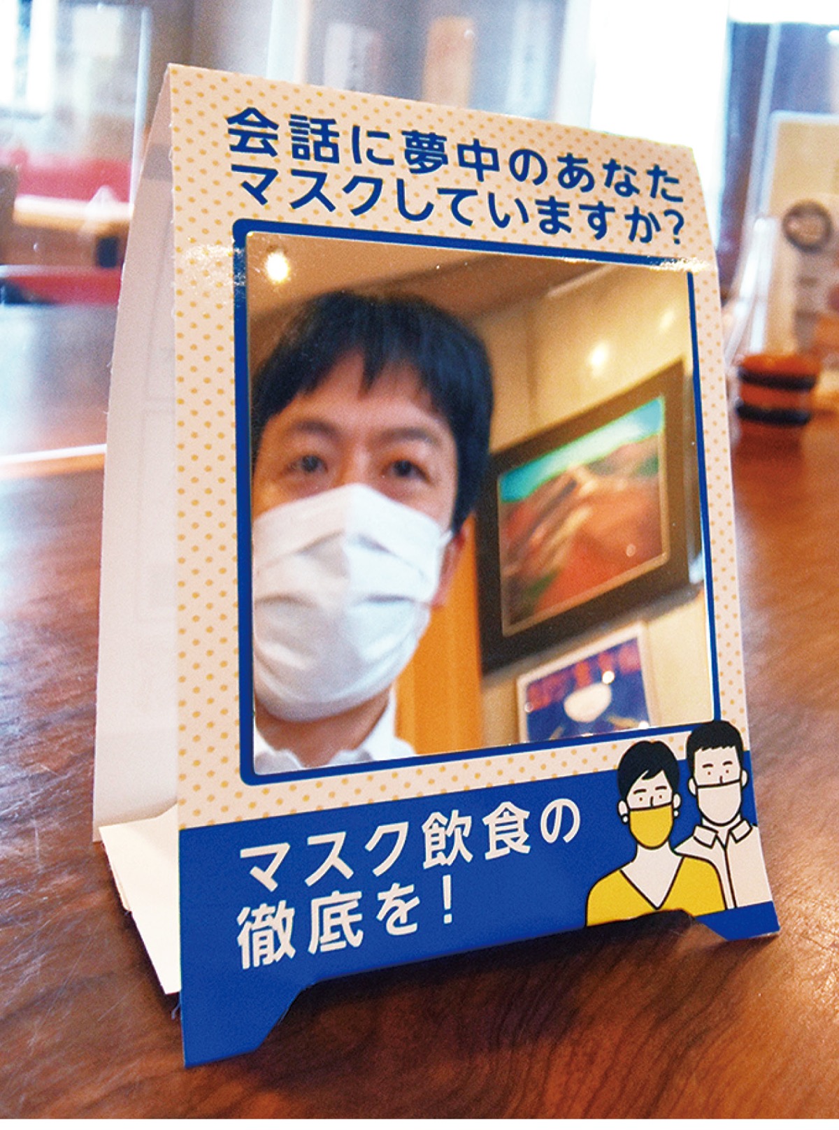 町役場近くのとんかつ水龍でもこの事業を通じて測定器やサーキュレーターなどを導入した。「測定器は音も出るし、雑談だけでも変化がわかります」と同店。各客席にはアクリル板が立ち、壁には「大きな声での歓談はご遠慮を」といった啓発も掲示している。