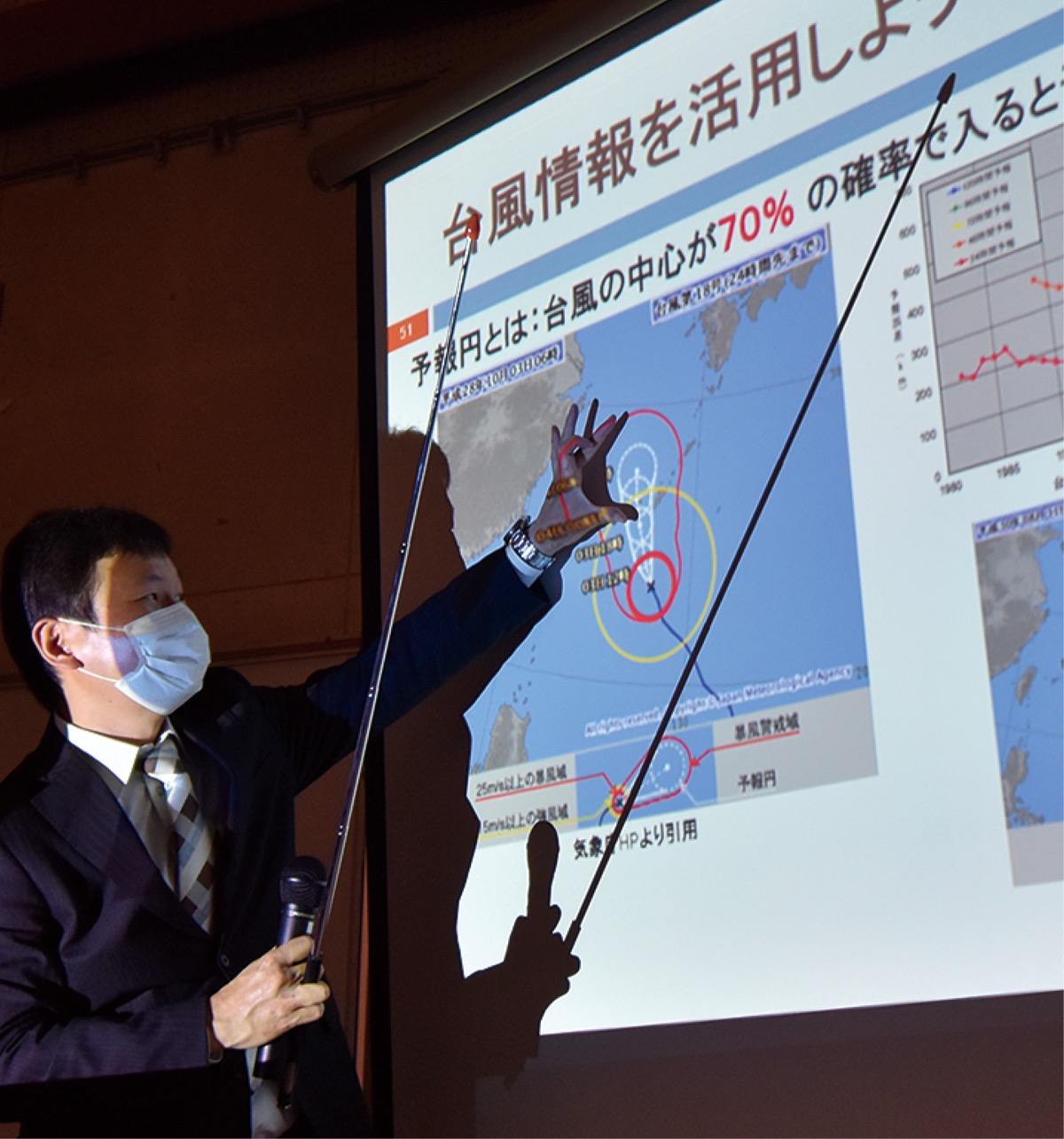 講座では、水害時の注意点をピックアップ。避難場所でも浸水エリアに重なること、産業道路の地下道など浸水ヵ所に車で入るとドアが水圧で開かなくなること、道が浸水すると用水路や蓋の外れたマンホールが見えないなど、リスクを写真付きで解説した。