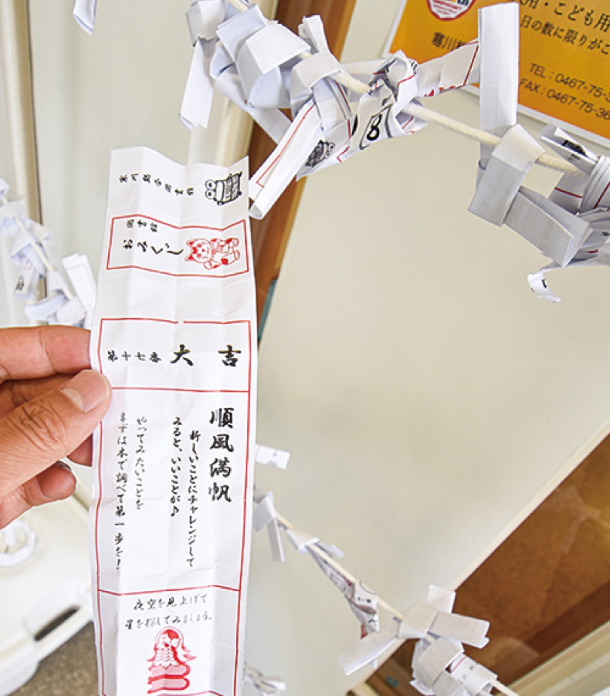 本を借りると引ける仕組み。大人用と子ども用があり、おみくじには「大吉」などの結果に加え「やってみたいことを本で調べて」など、さらなる読書にいざなう言葉も。玄関付近には結び処も用意。人気があり昼にはおみくじの数が少なくなる。8月31日まで。