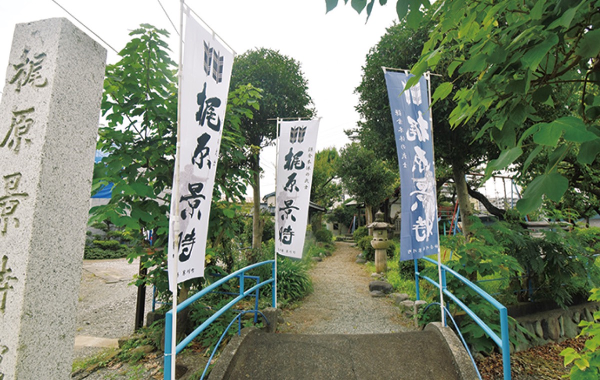 寒川町観光協会が鎌倉時代の武将・梶原景時ののぼり旗を作り、一之宮の館跡に設置した。青と白を試作し、文字は書道連盟の会員が揮毫。今後調整して完成させる。