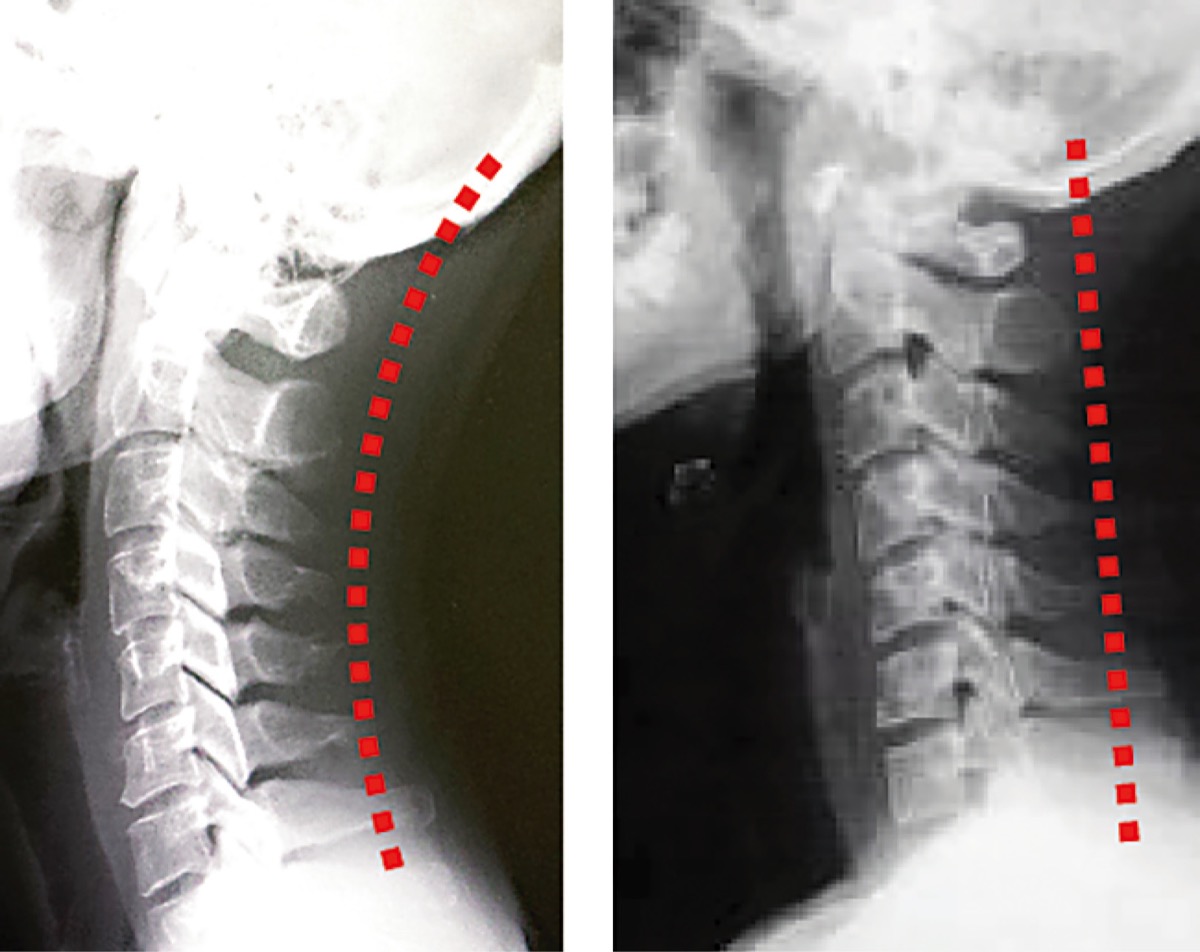 院長「座っているだけなのに痛む方もいます。スマホに向き合い、長時間うつむいた姿勢でいる事も要因でしょう。携帯ゲームで遊ぶ子が首や肩を痛めて来院する事も珍しくありません。本来頸椎は自然なカーブを描きますが『ストレートネック』は頸椎に負荷がかかります。頚椎の柔軟性が失われ頚椎が原因の神経症状が出ることもあります。