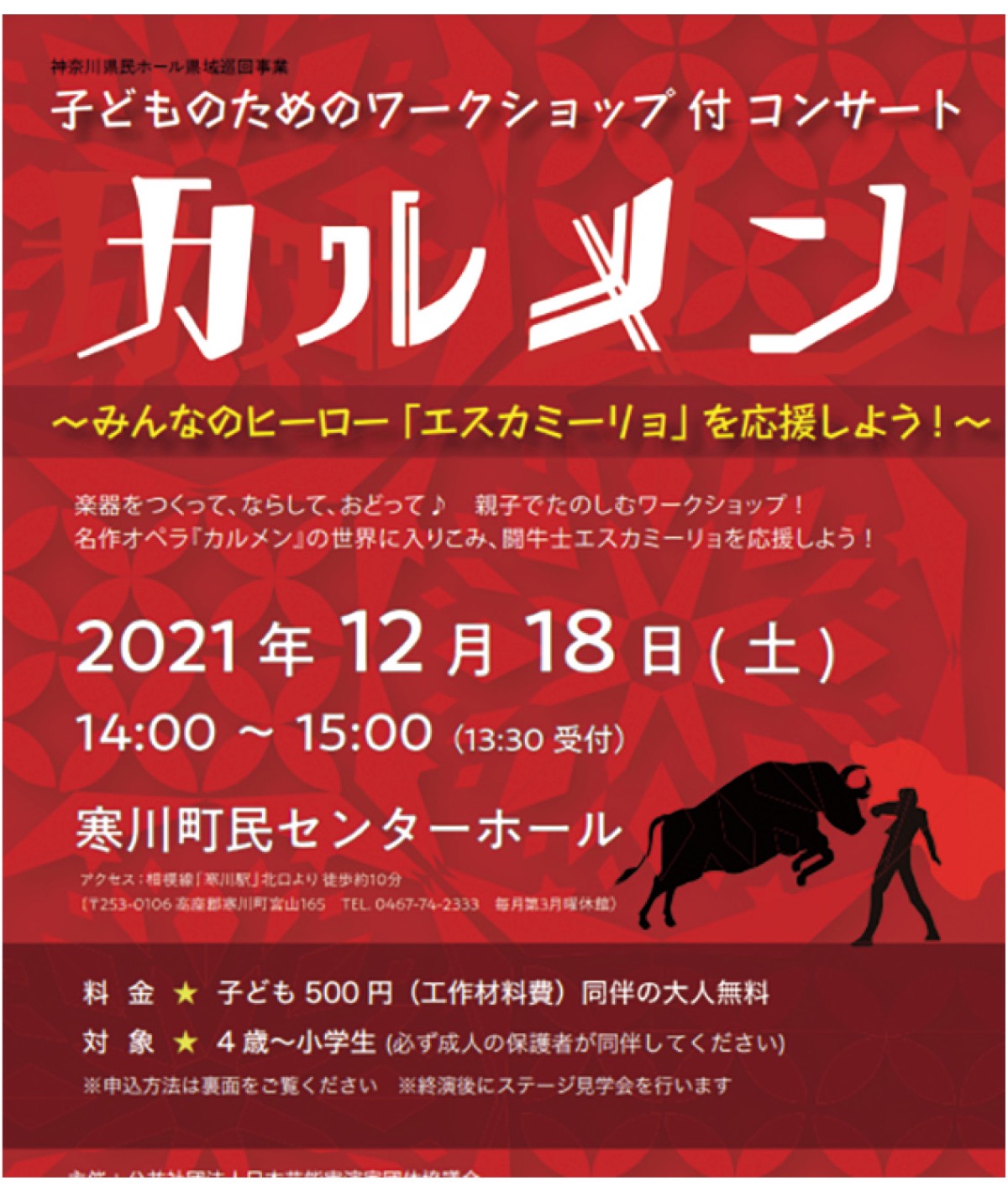 カスタネットを作って、一緒に演奏したり、フルートやピアノの生演奏を聴いたり、ダンサーと踊る、さらにステージに上がって舞台装置や楽器を見学できるユニークなオペラコンサート「カルメン」が12月18日(土)に町民センターで開催される。対象は4歳〜小学生、保護者同伴。料金は子ども500円、同伴の大人無料。11月6日(土)からチケットを町民センターと南北公民館で発売。