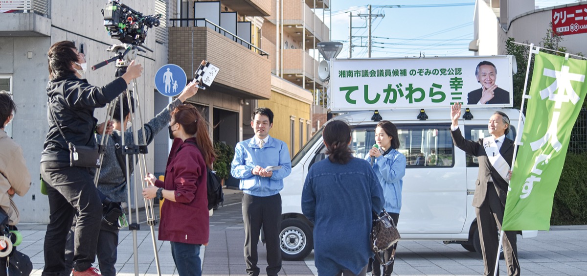 架空都市「湘南市」の市議選までの日々をコメディタッチで描く5話の短編集で、来年の一般公開を目指す。撮影はすべて湘南地域で行い、駅前では登場人物の選挙運動シーンを様々なアングルで撮った。三澤監督は俳優やエキストラに指示を加え「カット、OK」と声を響かせていた。
