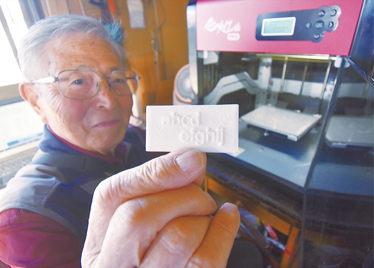 岡田に住む大久保治さん(83)が自宅の3Dプリンタで模型や生活用品を自作している。元々半導体関連で働いた事もあり「日曜大工の延長で」6年前に購入して始めた。今のプリンタは2台目。パソコンで作った図面に従い、コード状の樹脂を熱で溶かし、動くノズルが形を作る。失敗も重ねながら機械を調整し、完成度を高めてきた。今挑戦しているのは水に濡れても破れない名札作り。高齢者や認知症の患者に配るのが目標という。取材中も30分ほどで試作してくれた。
